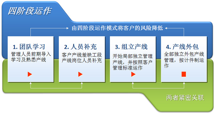 公司有着严格的管理模式,主要为服务企业进行三线管理(人事管理、生产管理、后勤管理)。从一线操作工到项目管理均为公司人员,他们掌握核心技术,拥有解决问题的丰富经验,确保产品质量。几年来,与20多家500强企业建立了良好的互信关系,切实有效的外包管理体系为世界五百强企业的发展保驾护航!